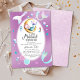 Um convite elegante, na moda e chique, chá de fraldas de menina com tema de sereia submarina, com uma sereia bebê dormindo em lua crescente, cavalo marinho, água-viva e outros elementos náuticos, todos pintados em aquarela, além de caligrafia doce para a manchete "Uma Pequena Sereia está a Seu Caminho" e o nome da mãe a ser.