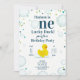 O tema da primeira festa de aniversário "Um Pato Sortudo", com pato de borracha cercado por confete azul e verde, bolhas e texto azul.