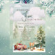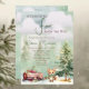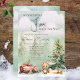 Cena da floresta de inverno "Uma Raposa Gira Está A Caminho!" design chá de fraldas. Possui uma árvore de abeto verde e um tronco derrubado com cogumelos crescendo e neve no chão com uma raposa fofa adornada com um cachecol verde. Ao fundo você pode simplesmente fazer as silhuetas de árvores cada vez mais verdes, algumas nuvens e neve. Perfeito para o seu Chá de fraldas de inverno ou Sprinkle.