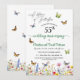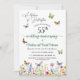 Um convite elegante para o aniversário do casamento verde com flores silvestres e borboletas coloridas que você pode personalizar adicionando seus detalhes.