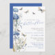 Um bonito chá de panela "A Lifetime of Butterflies" com hydrangeas azuis, borboletas e fontes de caligrafia.