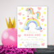 Este adorável design apresenta um unicórnio com um arco-íris de cor pastel. Corações e estrelas. Arco-íris em céus.