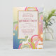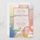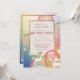 Este convite de festas personalizado apresenta um tema mágico e encantador. O fundo é um padrão de gradação do arco-íris. Dois unicórnios fofos são fotografados no fundo com pequenos arco-íris, nuvens, estrelas e o sol. Uma borda dourada enquadra a área de texto.