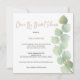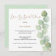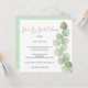 Estilo minimalista com um elegante galho de folhas de eucalipto subindo pelo lado direito, com tipografia à esquerda. Drive By Chá de panela é definido em um script moderno, e o resto do texto que você pode personalizar facilmente. Você também pode alterar a cor do plano de fundo verde de coordenação no verso, se necessário. O cartão quadrado dá um toque contemporâneo.