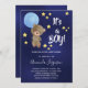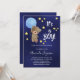 Para um chá de fraldas celebrando um menino. Um fundo azul marinho e estrelas amarelas. A cor azul é irregular. Um ursinho de pelúcia segurando um balão azul claro. Personalize e adicione o nome da mãe a ser e os detalhes da festa. O nome e o texto: É um Rapaz! são escritos com um estilo escrito à mão