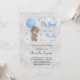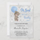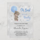 Para um chá de fraldas celebrando um menino. Um fundo de olhar mal prateado. Um ursinho de pelúcia segurando estrelas de balão azul. Personalize e adicione o nome da mãe a ser e os detalhes da festa. O nome e o texto: Oh Boy! e Barly são escritos com um estilo escrito à mão
