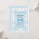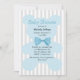 O convite ao chá do bebê na moda feito em uma cinza e padrão listrado branco, na frente, com uma silhueta azul de um ursinho de peluche com duas gravatas azuis como área de texto. O verso do convite é feito em azul sólido. Personalize todo o texto personalizado para atender às suas necessidades de evento.