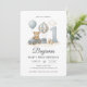 Celebre o seu pequeno ao completar UM ano com este urso de pelúcia azul e balão "beary primeiro aniversário". Um adorável urso de pelúcia em aquarela montado num carrinho de brinquedo está sob um balão listrado, nuvens suaves, blocos de madeira e um grande número 1—perfeito para um convite de primeiro aniversário de menino num estilo moderno e neutro. A paleta suave de azul pastel e cinza mantém o visual atemporal para fotos e lembranças.