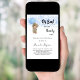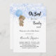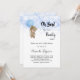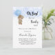 Para um chá de fraldas celebrando um menino. Um fundo branco. Um ursinho de pelúcia segurando um balão azul. Personalize e adicione o nome da mãe a ser e os detalhes da festa. O nome e o texto: Oh Boy! e Barly são escritos com um estilo escrito à mão.