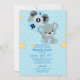 Barramento de Aquarela Bonito É um Convite para Balões Meninos com fundo azul, cinza, balões azuis e cinzas com ele é um menino, e estrelas amarelas. Mamãe vai adorar esse chá de fraldas de garotos alegres.