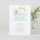 Estes convites adoráveis apresentam uma doce ilustração de um pequeno urso dentro de um bebê marrom bonitinho num barco de papel num fundo azul claro de lua e estrelas. Perfeito para chás de fraldas, batizar, batismo, primeira festa de aniversário do bebê, e muito mais!