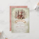 Urso de feriado bonito em um terno de papai noel, "É Um Menino e Nós Podemos", escreve "Esperança antecipada" Texto de Baby Sprinkle design com texto vermelho e castanho cinzento. Design apresenta um doce urso bebê aninhado com seus presentes de Natal apoiados por uma floresta de mocha e cinza com árvores enfeitadas e uma cor d'água castanho e sutil fundo verde. Uma faixa de cor-d-água verde para o texto do script fica abaixo. A parte de trás apresenta um fundo de verificação vermelho e branco, em relevo. Design composto por Designs Holiday Hearts.
