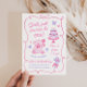 Um convite de aniversário de menina caprichoso em uma estética coquete rosa suave. Este design único desenhado à mão apresenta um urso de pelúcia, bolo, laços e borboletas para um tema de festa pastel e feminino. Perfeito para meninas de qualquer idade.