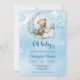 Design de Whimsical for boy Baby Shower convites apresenta um lindo ursinho azul de Watercolor e castanho sobre a lua no céu azul com nuvens. A tipografia de desenho manual diz "Oh Baby". Não hesite em contactar-me para obter itens ou personalizações correspondentes. Impressões violetas ©