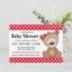 Um ursinho bonitinho com bolinhas e arco vermelho em seu cabelo faz um tema doce para um chá de fraldas. Com seus sotaques brilhantes de bolinhas em vermelho e branco, o texto do convite está pronto para ser editado com os detalhes do seu chá.