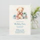 Convite de aniversário com uma ilustração fofinha com um urso bonito de pelúcia. Vestindo um arco vermelho rico. Desenhado em um estilo vintage bonito e antigo. O pastel vermelho e azul rodeia este urso de coração quente.