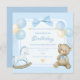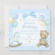 Imagem de aniversário com fundo azul, apresentando um urso com um arco azul ao redor do pescoço, um cavalo de balanço branco com pontos azuis e balões azuis e beges
