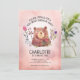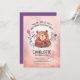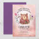 Este convite de aniversário de menina simples e fofo apresenta um tema de urso marrom. O fundo cor-de-rosa macio é acentuado por um gráfico de aquarelas de um urso pardo e flores rosa e roxas.
