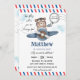 Personalize este convite de aniversário em estilo cartão-postal fofo com seus detalhes de forma fácil e rápida. Basta clicar no botão Editar Usando Ferramentas de Design para editar ainda mais o texto, a redação, o estilo da fonte, o tamanho da fonte, a cor da fonte e adicionar ou remover texto. Apresenta um urso fofo pilotando um avião azul empoeirado com um carimbo de "você está convidado" e um título "o tempo voa quando você está se divertindo". Todo o texto é editável. Personalize-o para se adequar à sua ocasião. Itens correspondentes disponíveis na loja! (c) The Happy Cat Studio
