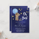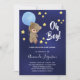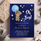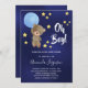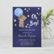 Para um chá de fraldas celebrando um menino. Um fundo azul marinho e estrelas amarelas. A cor azul é irregular. Um ursinho de pelúcia segurando um balão azul claro. Personalize e adicione o nome da mãe a ser e os detalhes da festa. O nome e o texto: Oh Boy! são escritos com um estilo escrito à mão