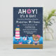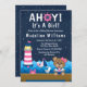 Este belo e divertido convite apresenta um urso marinheiro náutico num convés de madeira com uma gaivota e um caranguejo. Ao fundo há um farol rosa e branco, um pássaro giro em um veleiro, ondas oceânicas e um marinho azul estrelado céu noturno. O texto combina fontes em negrito e sem serifa para uma aparência na moda e moderna. Isto é perfeito para um chá de fraldas temático náutico.