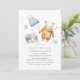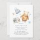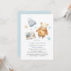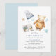 Convites de chá de bebê, com um tema de inverno bonito, com ilustrações aquáticas de um ursinho de pelúcia, um livro e um chapéu de bebê. Branco com sotaques azuis pastéis. A design neutra do gênero é perfeita para um bebê ou uma menina.