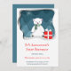 Adorável convite de aniversário com uma ilustração de um pequeno urso polar sentado no chão vestindo lenço verde. Ele tem um presente vermelho brilhante. Excelente para festas de chá de fraldas. A imagem parece estar em três dimensões, mas é apenas um impressão. Ilustrada e projetada por Patricia Alvarez.