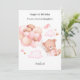 Celebrar um aniversário especial com este adorável e caprichoso cartão com um ursinho de pelúcia bonitinho flutuando entre nuvens fofinhas e segurando um buquê de balões pastéis em tons azuis, cor de pêssego e bege. O design alegre é acompanhado por detalhes lúdicos como estrelas e um pássaro encantador. Perfeito para crianças ou qualquer pessoa que ame designs doces e encantadores, este cartão é personalizado com o nome do destinatário por um toque atencioso e único.