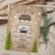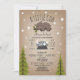 Um convite de chá de fraldas com ilustração de um bebê urso solto em um galho de árvore cercado por estrelas. Ilustração de montanha e árvores no fundo. Personalize o texto. O plano de fundo é o estoque de cartões inspirado.
