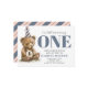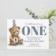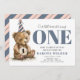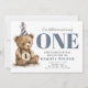 Nosso filhote de urso está fazendo um primeiro convite de aniversário para bebês. Matizes azuis e marrons. Urso na festa que segurava madeira com o número um! Bonito aquarelas brancas brancas, que são excelentes de convites neutros em relação a gênero para rapazes e raparigas. O dorso tem faixas diagonais em rosa e azul. Moderno estilo animal rústico da floresta. Whimsical e fofo.