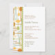 Os instrumentos de estilo retrô para cozinhar e alimentação são apresentados neste maravilhoso convite para um Chá de panela "estocar a cozinha" para a futura noiva. O esquema de cores muda é divertido e neutro com garfos, colheres, facas, espátulas e uísques em tons de número, ouro, marrom e verde-sábio, colocados sobre um fundo branco, e um toque de branco com uma borda de fita ric "falsa" em sábado.