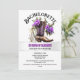 Uma bota castanha de couro trabalhado tem flores roxas nela e verde e uma taça de flauta de vinho espumante rico e um coquetel de martini ao lado dela descendo sobre uma banda horizontal pálida prateada de shimmer. Há modelos de cor lavanda e preto editáveis em um fundo branco estrelado que podem ser personalizados para se adequarem a sua ocasião especial. Este convite para descarregamento de na moda é ideal para uma festa de solteira de temas ocidentais, "botas e borras" do país ou "botas e borbulhas"; chá de panela; aniversário ou evento especial.