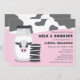 Se o tema do seu chá de fraldas é Leite e Cookies, então este convite é perfeito! Esta design apresenta uma garrafa de leite e uma vaca fofa na frente com uma pilha de biscoitos. As cores são preto, branco e rosa.