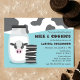 Se o tema do seu chá de fraldas é Leite e Cookies, então este convite é perfeito! Esta design apresenta uma garrafa de leite e uma vaca fofa na frente com uma pilha de biscoitos. As cores são preto, branco e azul.