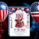 A mais fria vaca da Highland a esporcionar um par de óculos escuros e acenando uma bandeira sob um arco patriótico de balão em vermelho, branco e azul é a base dessa celebração de "CHURRASCO" em 4 de julho.