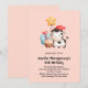 Convite de aniversário com uma imagem adorável com uma vaca sorridente, com um balão de estrela dourada, um bolo e um presente.
