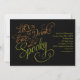 Este design apresenta as palavras "Vamos come, bebe e be spooky" em um escrevendo de guião laranja e verde à esquerda e os detalhes da sua festa em verde à direita. Colocado sobre um fundo preto.