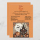 "Vamos Fang Out" - Uma casa assombrada Convite de festas de fantasia de Halloween para assustar-se. A ilustração tem lanternas Jack O, morcegos na configuração de uma casa assombrada assustadora com fundo de cor de tijolo. O texto pode ser facilmente personalizado com a sua escolha de palavras e estilo.