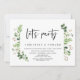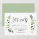 Modelo de convite de casamento íntimo com tema de verão, folhas verdes e grafia preta moderna (Vamos Festejar). É perfeito para o seu jantar de recepção de casamento íntimo ou festa de celebração pós-casamento. Adicione seus detalhes em fonte preta correspondente.