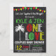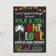 UM CASAL DE AMOR, CHÁ DE FRALDAS JAMAICAN REGGAE, TIMECEU CONVITE DE FESTAS. Faz um convite de festas chá de fraldas casal divertido e memorável! O convite apresenta gráficos temáticos jamaicanos/reggae em um fundo falso de quadro de discussão.