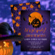 Design de Halloween moderno para festa de aniversário espetacular com abóbora assustadora e fundo roxo de lua laranja. Uma design neutra em termos de gênero, perfeita para as comemorações de outubro! Modelo é fácil de personalizar.