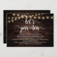 Cartão de Chá de panela para caligrafia moderna (Vamos Par-tea), em luzes de cordas de madeira escura rústicas, design temática. Convide os convidados com este Cartão de Convite perfeito. Adicione os detalhes do seu chá de panela em texto correspondente.