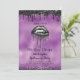 Vampiro editável convite de festas adulto Halloween. Design apresenta lábios pretos pingando com sangue e presas de vampiro em um fundo metálico roxo e pearlescente! O brilho do brilho preto, a brilha preta e os brilhos enquadram a placa. Personalize o texto e altere o estilo e a cor da fonte para se adequar. O brilho não é "real", mas sim um efeito impresso. O fundo metálico roxo não é brilhante, laminado ou metálico, mas sim um efeito impresso.