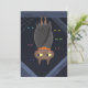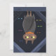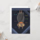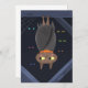 Um morcego marrom e grande, amarelo, veste uma gravata de arco laranja e pendura de cabeça para baixo na borda de um celeiro velho. Ilustração original de Noël Snow.