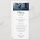 Cartão de menu com foto de um veado real com galhadas em uma floresta sombria entre árvores iluminadas pelo sol. Neve caindo por toda parte.
