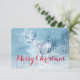 Um cartão de Natal feliz com a imagem de um veado majestoso no inverno. Um fundo azul gelado filtrado dá a esta foto um olhar frio de inverno com um toque mágico. Um veado nobre fica em uma colina com pinheiros do inverno ao fundo