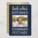 Olha quem está se aposentando! Convide colegas, colegas de trabalho, familiares e amigos para uma celebração especial de aposentadoria com convites de festas de fotos elegantes e personalizados. O quadro e toda a redação desta modelo são simples de personalizar. (DICA DE IMAGEM: Uma maneira fácil de posicionar uma foto exatamente como você deseja é recortá-la antes de carregá-la no site do Zazzle.) O marinho azul e ouro moderno apresenta uma foto do aposentado, um fundo azul escuro ombre, folha de ouro falso, caligrafia por na moda e tipografia clássica da arte de vintage. Observe que o ouro é impresso a cor, não a folha metálica. A design neutra do ponto de vista do gênero também é adequada para um homem ou para uma mulher. Saúde, Parabéns e boa aposentadoria!