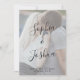 Este moderno salvamento da data apresenta bonito caligrafia e um elegante visual faux vellum. Na frente do cartão, os nomes dos casais são escritos em um roteiro preto moderno. Abaixo, adicione a data e o local do casamento. O design de tipografia preto cobre uma foto de cheio (orientação vertical). Na parte de trás da data de salvamento, adicione outra foto e detalhes do casamento, como o site do casamento.