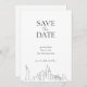 Mínimo moderno salve a data com uma paisagem urbana desenhada por linha e fontes quic sobre um fundo branco, o que contrasta maravilhosamente com preto escuro.