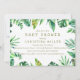 Um design de convite de chá de fraldas elegante com um quadro de cor d'água tropicale em aquarela em vários tons verdes.